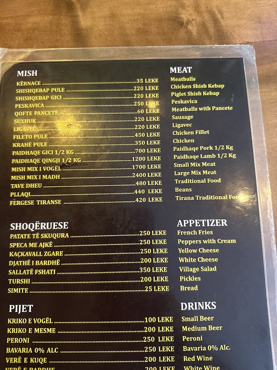 The staff was polite and friendly, the food tasted great and was affordable. All the tables were occupied when we arrived but that wasn't a problem apparently as two guys emerged from the inside carrying a table for us to be able to sit outside. Menu is in english and they also speak solid English. Great way to experience the Albanian cousine and hospitality amongst the locals